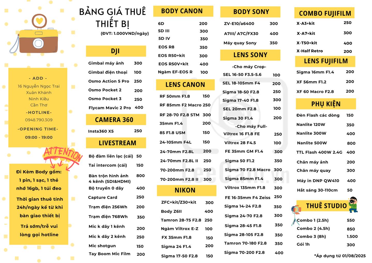 Bảng giá thuê máy ảnh ở Cần Thơ tại LeeCam (tham khảo)