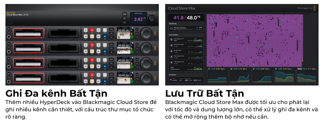 Xây dựng hệ thống phát lại cao cấp là dễ dàng với sự tập trung vào lưu trữ và sự kết hợp giữa nhiều HyperDecks và DaVinci Resolve. Bạn có thể tùy chỉnh số lượng kênh và định dạng video theo nhu cầu của mình, và thậm chí mở rộng lưu trữ và số kênh một cách linh hoạt.