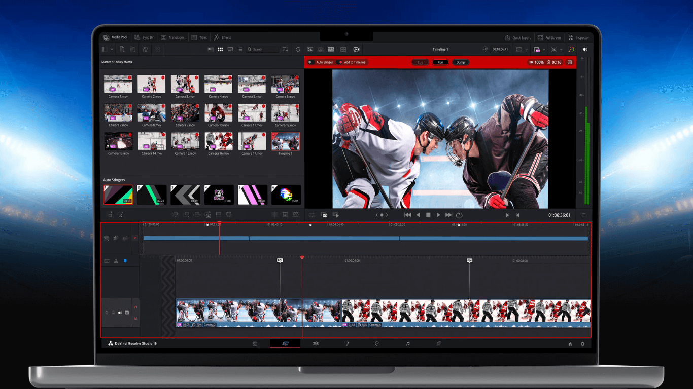 DaVinci Resolve tích hợp sẵn auto stingers giúp giảm công việc và tạo hiệu ứng chuyển đổi tự động chuyên nghiệp cho mỗi phát lại.