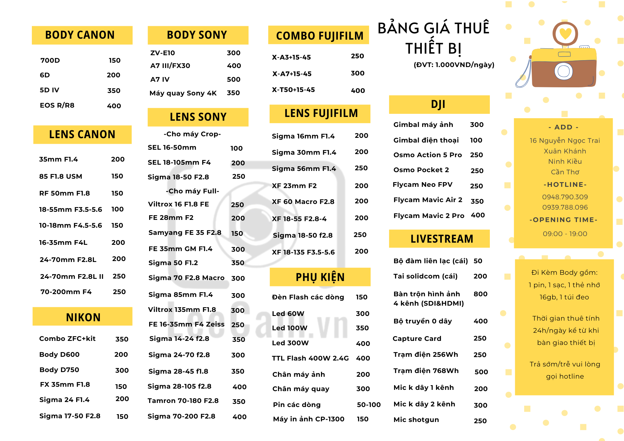 Tại Lee-Cam khách hàng có thể thuê trải nghiệm các dòng máy ảnh trước khi mua, hoặc phục vụ cho nhu cầu công việc. Với mức giá chỉ từ 100k/ngày/sản phẩm cùng thủ tục linh hoạt chỉ cần: (CCCD+GPLX) hoặc (CCCD+Cavet Xe) hoặc (CCCD+Thẻ Sinh Viên)....